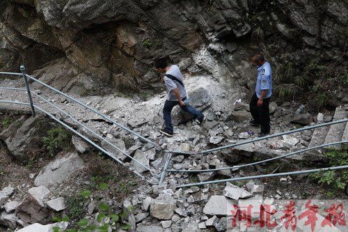 一雙紅色的男士運動鞋,躺在碎石塊中,眼鏡、相機、零食散落一地。出事景點的山道下,已樹立了一個木制的牌子,“前方施工,禁止通行。”并派人員把守,阻止游客進入。 ■“碎石如雨點一般墜落” 昨日下午,記者在醫(yī)院見到了多名傷者,他們都是河北師范大學(xué)職業(yè)技術(shù)學(xué)院與河北經(jīng)貿(mào)大學(xué)的學(xué)生。頭上纏著繃帶的石海還沉浸在驚恐中,他告訴記者,悲劇發(fā)生時,他正要通過一座小橋。 “一聲巨響,碎石如雨點一樣,從山上飛落下來”,他說,好多人瞬間被碎石砸中。這一過程大約持續(xù)了六七秒鐘,之后山路上騰起一片煙塵。 在石海亮身后大約20米,處于安全地帶的房明宇目睹了這一過程,時間是11時30分許,“抬頭一看,路左側(cè)山頂有一塊巨石正滾落下來,巨石又砸到山壁上,碎成了小塊向下飛濺�!� ■輪流背著同學(xué)走了30分鐘 房明宇回憶說,突如其來的變故,讓他遲愣了幾秒鐘。直到聽到有人喊,“快去救受傷的人�!� 他和班里十幾個男生立馬迎了上去�!耙幻鷾喩硎茄�,另一名胳膊受傷的男生扶著她,邊往下走邊喊救命�!狈棵饔钫f,他小跑著過去,背起這個女生就往山下的醫(yī)務(wù)室走。房明宇不敢走得太快,與同學(xué)李江浩交替著背了30多分鐘,把她送到了景區(qū)的醫(yī)務(wù)室。 一個在小橋上拍照的游客,被石頭砸中頭部,直接掉到了橋下的溪水里。陳振陽、趙二松、張強、高猛四個同學(xué),趕過去后,直接跳入水中,把那個男生抬到了岸邊。但由于傷勢過重,該男生不久死亡。 隨后,受傷的學(xué)生們,被先后送往醫(yī)院。 ■景區(qū)稱 滾石與下雨有關(guān) 王習(xí)杰稱,此次景區(qū)的山頂滾落石塊,與5月11日的下雨有關(guān)�!拔覀兘�(jīng)常派人員對松動的石頭進行檢查,一旦松動,就會及時處理�!蓖趿�(xí)杰說,“但有些地方太高,人根本夠不著�!� 據(jù)了解,在事故中死亡的男孩,為河北經(jīng)貿(mào)大學(xué)的學(xué)生。目前,景區(qū)與靈壽縣旅游局都在積極處理善后事宜。